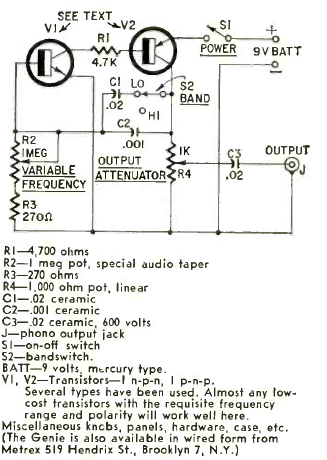 This audio oscillator operates like a signal injector in a frequency given by C1. The circuit was published in the Radio Electronics magazine from may 1962. Power comes from a 9 V battery.