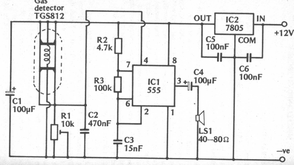 This 1989 circuit uses a gas sensor from the era, which is hard to find these days. The circuit triggers an oscillator that has a medium impedance speaker as its load.