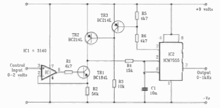 Using the CMOS version of the 555, this circuit generates voltage-controlled signals in a range that depends on the value of capacitor C1. The signals are rectangular.