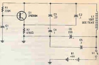 We found this transmitter in a Popular Electronics from 1992. The circuit transmits in the range of approximately 7 kHz, depending on the L1 coil. The transistor can be power type like the TIP31.