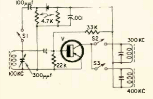 This 300 kHz and 400 kHz two-channel transmitter for TV remote control appeared at Radio Electronics in June 1952. Transistors were already taking over portable applications by this time.