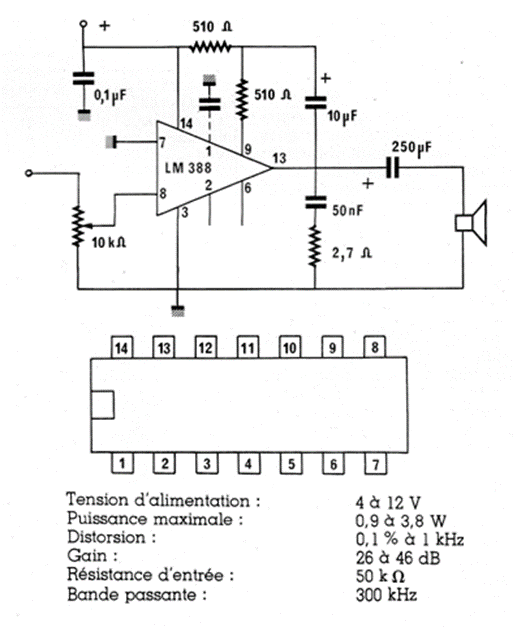 The traditional circuit was taken from a French magazine Radio Plans that no longer exists but can still be assembled as the IC can still be found, although with some difficulty. Power depends on supply voltage and load.