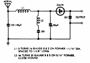This crystal shortwave radio can tune signals up to the VHF range of analog TV (which no longer operates). The headphone can be crystal, or the output applied to an external amplifier. The circuit is from a documentation from the 70s.