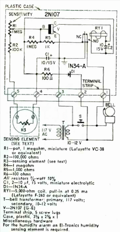 This water-triggered relay circuit was found in a Radio Electronics from May 1959. The circuit has only one transistor and triggers a sensitive relay.