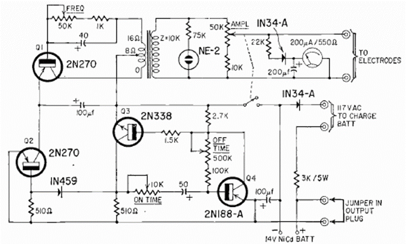In fact, this circuit found in a Radio Electronics from November 1964 is a high voltage generator whose purpose is to excite muscles through electrodes. The circuit is powered by a battery and the transformer determines the maximum excitation voltage, adjusted by a potentiometer.