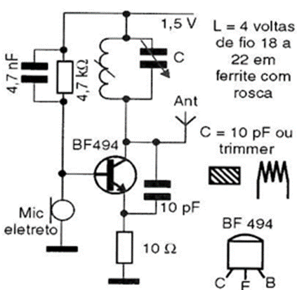 Our next circuit consists of an FM transmitter having a slightly greater range than the CIR24101. Here, the components are commonplace, and only the connection of the transistor and the electret microphone should be observed. The coil is formed by four turns of common wire on a ferrite core. As in the previous circuit, the length of the antenna can be between 1 and 20 cm and the wire used can be any, as long as it is self-supporting. Button batteries can be used, which gives the assembly a very small final size.