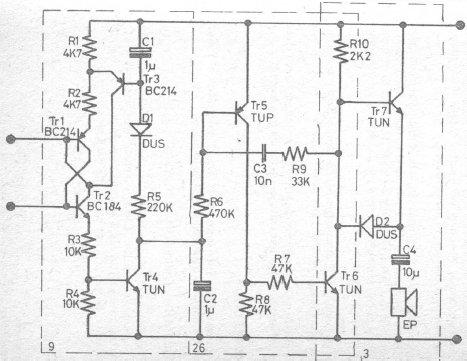 With this name, the English publication where we found this circuit indicated a sensitive touch detector. The circuit can use equivalent current transistors and the circuit triggers a buzzer.