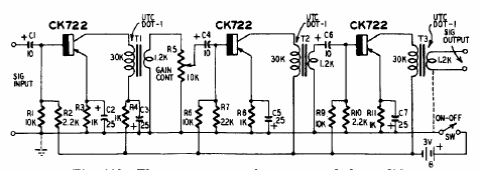 This circuit with transformer coupling was found in an American documentation from the 50's. There are 3 stages with common emitter configuration.