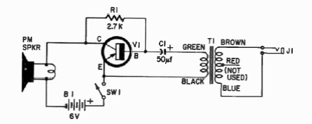 This circuit makes use of a 2N301 germanium power transistor. We found it in a documentation from 1966. The transformer has 500 ohms x 1k windings.