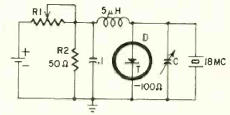 Another one of the many possible oscillators using tunnel diodes. This has its frequency determined by the crystal. R1 can be from 100 to 470 ohms and the power supply is a common 1.5 V cell.