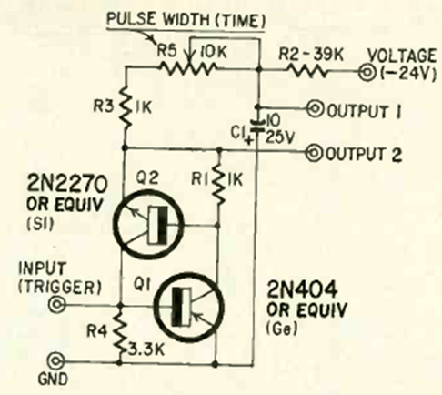 This monostable circuit appeared in Radio Electronics magazine in October 1965. The circuit simulates an SCR with two complementary transistors. The monostable time is given by the capacitor.