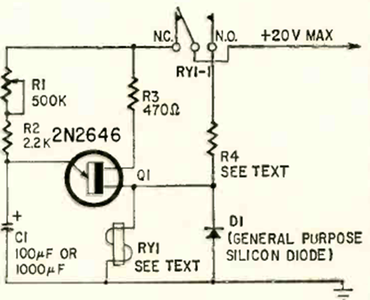 This unijunction transistor circuit was found in the Radio Electronics magazine from June 1968. The relay is a sensitive type that determines R4 according to the voltage. The delay ranges from 3 seconds to 8 minutes depending on the R1 setting.