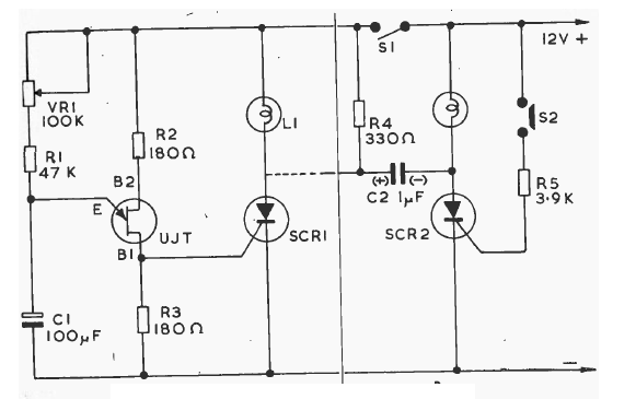 This flasher with a bistable version formed by SCRs works with low voltage incandescent lamps. The unijunction can be a 2N2646. Frequency is set in VR1.