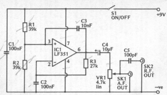 This circuit was found in an English publication from 1989. The integrated circuit is an operational amplifier that admits equivalents. The circuit has a signal strength control.