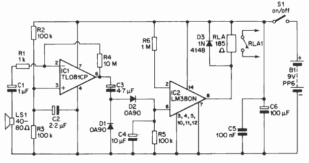 This sonic switch, sound relay or simply vox uses a medium impedance speaker as a microphone. The circuit is from the 90's and the relay must be type according to the supply voltage.