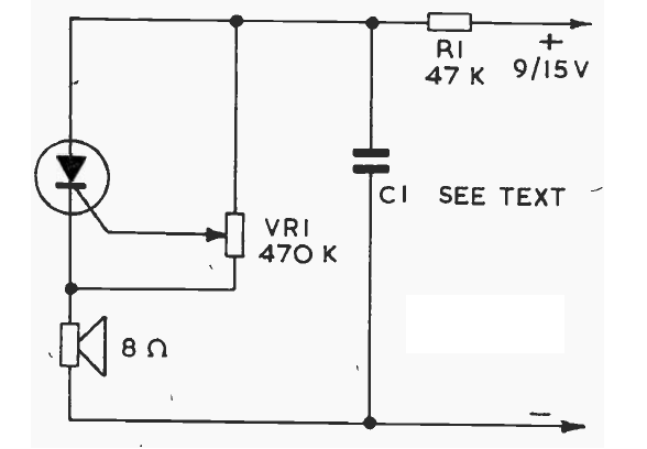 This SCR relaxation oscillator was found in old documentation. The SCR can be TIC106 and the capacitor C1 can be from 10 nF to 470 nF for audio frequencies.