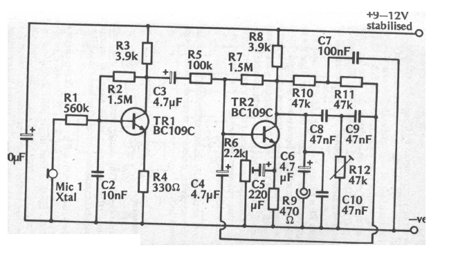 Found in an English publication from the 1980s, this circuit can be built with equivalent transistors such as the BC549. The signal must be applied to an external amplifier.