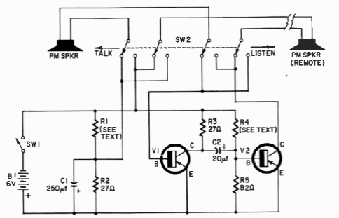 This two-station intercom was found in documentation from 1966. R4 should be experimentally obtained at between 470 ohms and 4k4 typically. The transistors are 2N301.