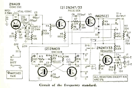 We found this bench circuit in a Radio Electronics magazine from July 1962. The transistors are from the time, thus limiting the generated frequency to a few tens of megahertz.