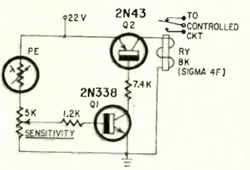 This circuit is from a Radio Electronics from October 1963. The LDR and transistors are from the time, but the circuit can be assembled with modern equivalent components. The supply voltage depends on the relay used.