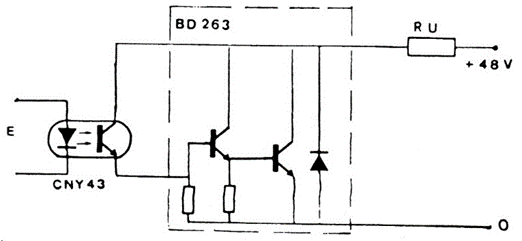 The transistor used is a high current Darlington, but an equivalent discrete configuration can be used. The circuit is from old French documentation and the power supply depends on the load. In this case, an example was given, a 48V relay. Optical couplers and discrete transistors can be used.