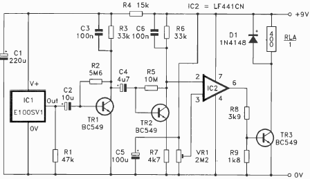 Using a period sensor, this circuit triggers a relay when pressure changes occur. The circuit is from an English documentation from 1995. The relay is according to the supply voltage.