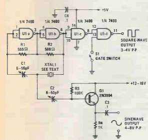 This TTL oscillator was found at Popular Electronics in 1992. It provides both sinusoidal and square signals. It must be powered with 5V.