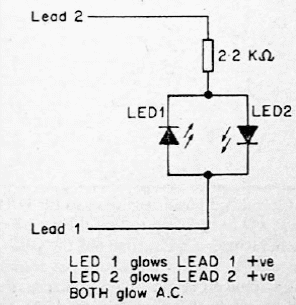 This is a simple voltage tester for voltages from about 2V to about 15V with the indicated resistor and red LEDs.