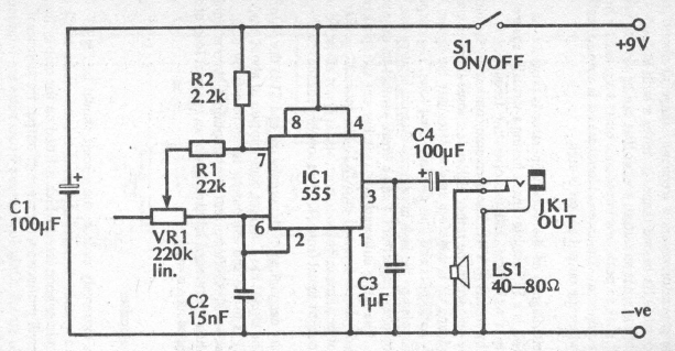 This circuit generates a tone whose frequency is set at VR1. The signal is reproduced in a loudspeaker or applied to an external circuit via the output jack.