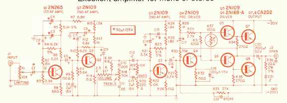 Using period transistors, this 10 W amplifier was found in Radio Electronics magazine from May 1963. Power transistors must be mounted on heat sinks.