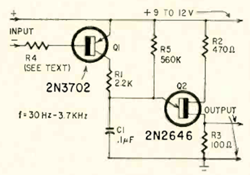 Found in Radio Electronics magazine from June 1968, this circuit produces signals from 30 Hz to 3.7 kHz depending on the input voltage. The range of values can be changed by changing C1.