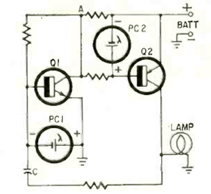 This circuit is from a Radio Electronics from April 1965. It uses an incandescent lamp, and the sensor is an LDR. Component values have not been indicated but can be deduced. The capacitor determines the frequency.