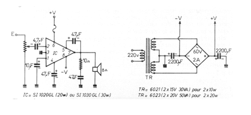 This amplifier uses Sanken hybrid modules that can still be found in some suppliers, as they are also used in automation and control circuits. It can provide powers of 20 or 30 W, depending on the module used and the power supply. The circuit requires a well-planned board and a good dissipation area for the hybrid module. The sound quality obtained is excellent as the module was used in several commercial products of the time (70s and 80s).