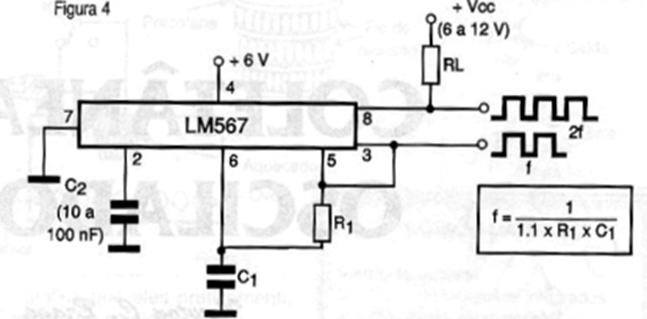 The LM567 is a PLL tone decoder that can also be used as a dual oscillator as seen in the circuit in the figure. The supply voltage must be between 5 and 10 V, and the maximum operating frequency must be around 100 kHz. The values of the components depending on the frequency to be generated can be calculated using the formula given next to the diagram. Note that the signal waveform is rectangular, and one of the outputs has twice the frequency of the other.