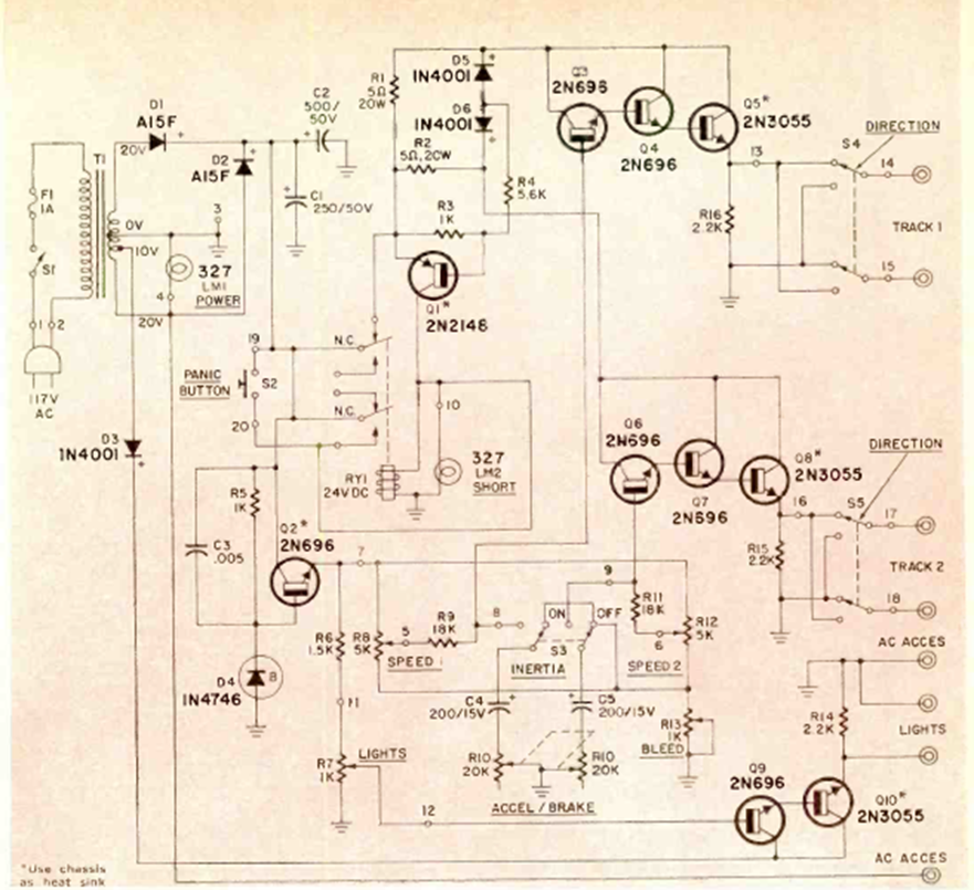 This sophisticated model railway controller was found in the November 1969 issue of Radio Electronics magazine. The all-transistor circuit supports many modern equivalent transistors. The transformer is high current in keeping with the transistors.