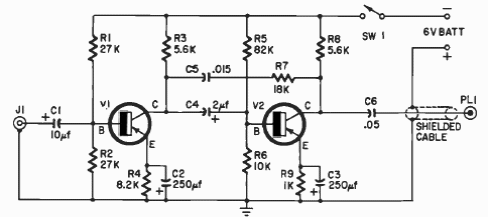 This headphone amplifier was found in a 1966 documentation. The transistor is made of germanium and the headphone can have 600 ohms to 2000 ohms of impedance.