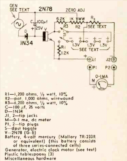 This assembly circuit using a small motor as a generator was found in Radio Electroics magazine from September 1978. The circuit is powered by 3 batteries.