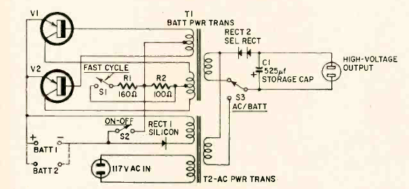 This is the circuit of a commercial flash from the 60’s. We found it in a march 1961 Radio Electronics magazine. The circuit is powered with two batteries and uses a voltage inverter transformer.