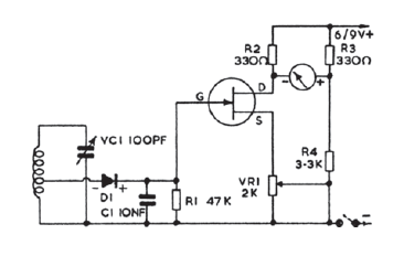 Found in old English documentation this circuit evaluates the power of a transmitter. The circuit has coil according to frequency and the instrument must be 50 or 100 uA with zero in the center of the scale.