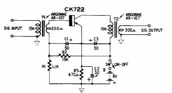 Found in an American publication from the 50's, this circuit uses input and output coup-ling transformers. The transistor is the CK722.