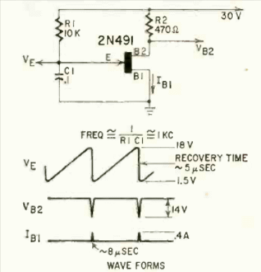 This is an old circuit with a unijunction transistor from that time. We found it in a Radio Electronics from around 1959. The circuit has a frequency determined by C1 and R1.