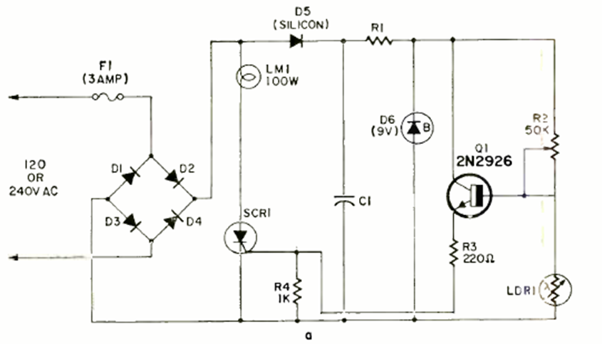 This circuit appeared in the July 1969 issue of Radio Electronics magazine. The sensor is an LDR. and the circuit is a full-wave control. The diodes must be rated for the lamp power, as must the SCR.