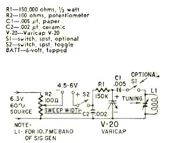 This circuit for tuning FM receivers was found in the November 1960 Radio Electronics magazine. The circuit uses the 60 Hz power grid frequency for scanning.