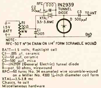 This CW transmitter for the 3,5 MHz band, low power, was published in a march 1961 Radio Electronics Magazine. The circuit uses few components and is powered from a 1,5 V cell.