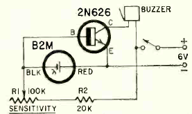 This circuit uses the 2N626, the first commercial Darlington transistor. We found it in Radio Electronics magazine from June 1961. The sensor is a photocell of the time.