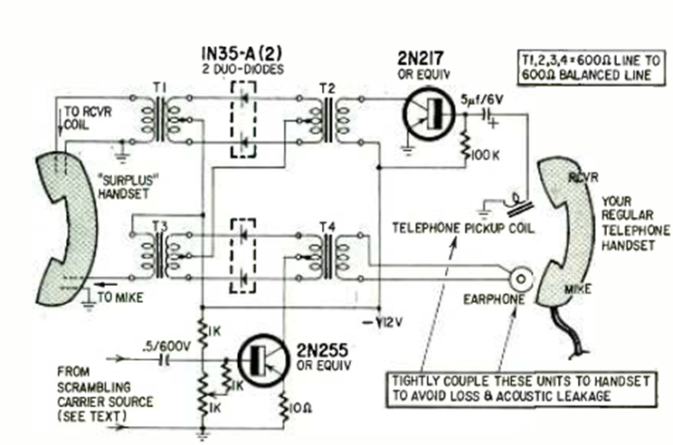 This voice scrambler and descrambler circuit was found in a Radio Electronics from July 1963. Transformers are common types at the time with impedances according to telephones and line.