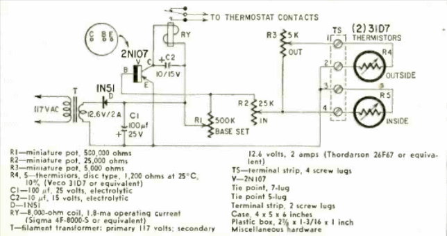 This thermal control circuit appeared in Radio Electronics magazine in October 1958. The circuit is powered by the power grid and has two sensors that operate in a differential mode.