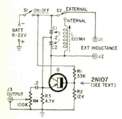 This 1-transistor oscillator circuit was found in the March 1965 Radio Electronics magazine. The circuit serves as an oscillator and test for inductances. The transistor is from the time.