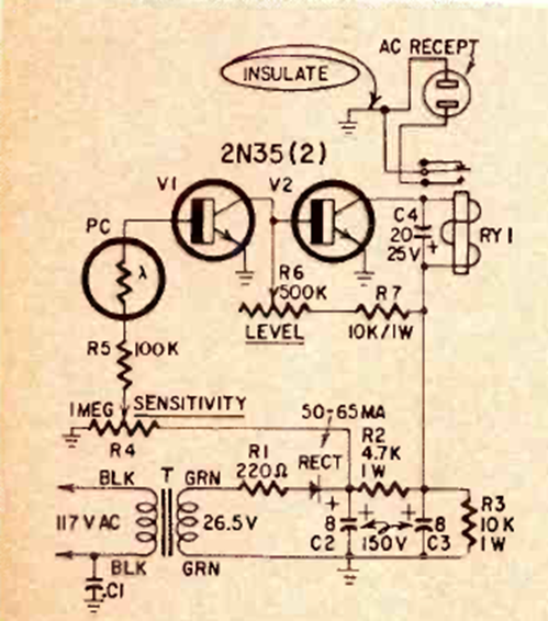 This two-transistor circuit is from a Radio Electronics magazine from April 1965. The transistors are from the time and the relay according to the supply voltage is the sensitive type with a 5,000-ohm coil