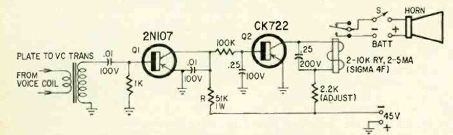 This circuit activates a horn from an audio signal. This can be used for remote control via audio signals. The circuit is from a Radio Electronics from October 1965.